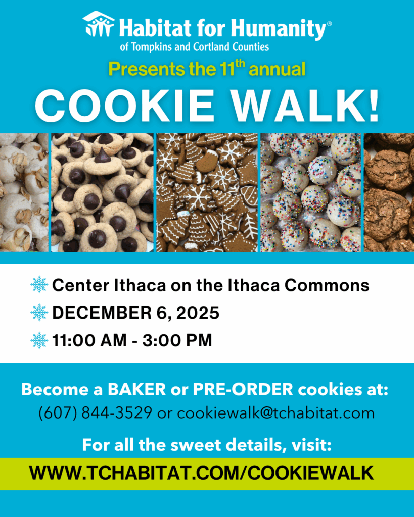 Habitat’s 11th Holiday Cookie Walk will take place on Saturday, December 6th from 11 am – 3 pm in Center Ithaca on the Ithaca Commons. If you are interested in volunteering as a baker or a Cookie Walk Elf on 12/6, please see more information here! If you have any questions or comments about the Gift Drive or Cookie Walk, please contact us at info@tchabitat.com or call/text at 607-844-3529